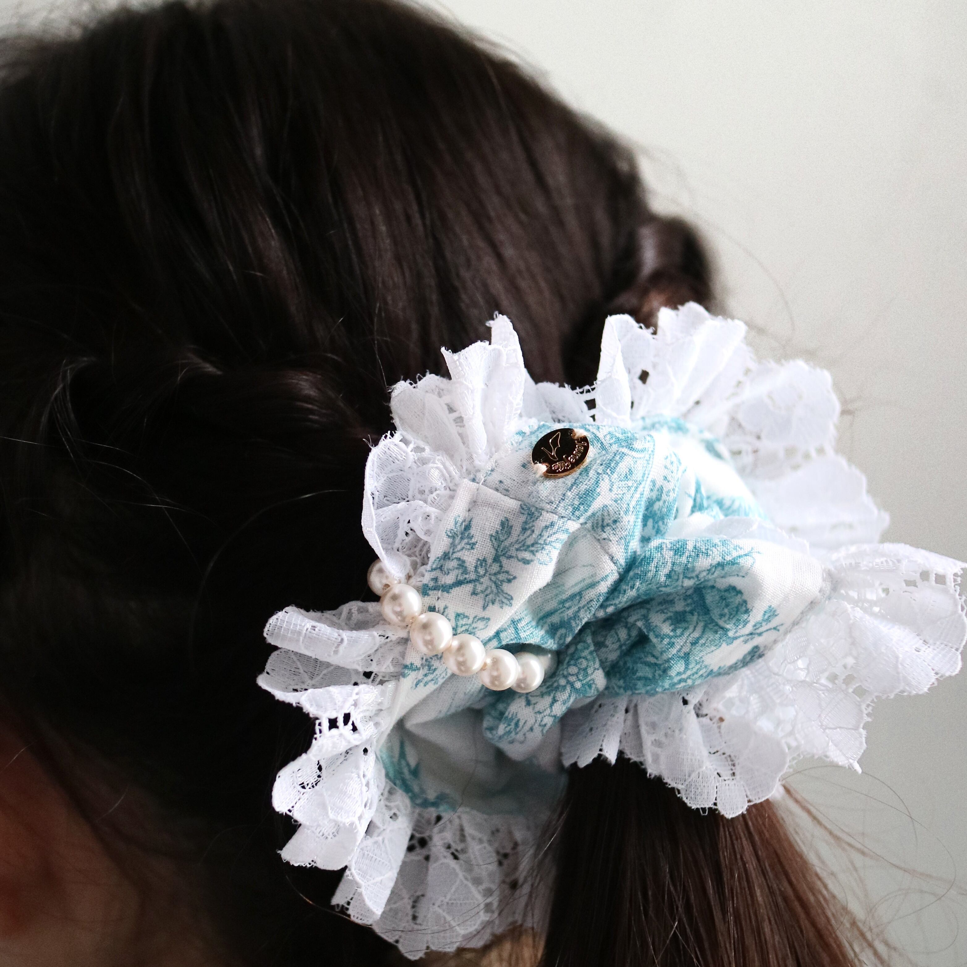 【 フェミニン 】をテーマにしたこのシュシュは、フランスの優雅なトワルドジュイ生地とパリのラグジュアリーなレースを組み合わせた、華やかさとフェミニンな魅力あふれています。