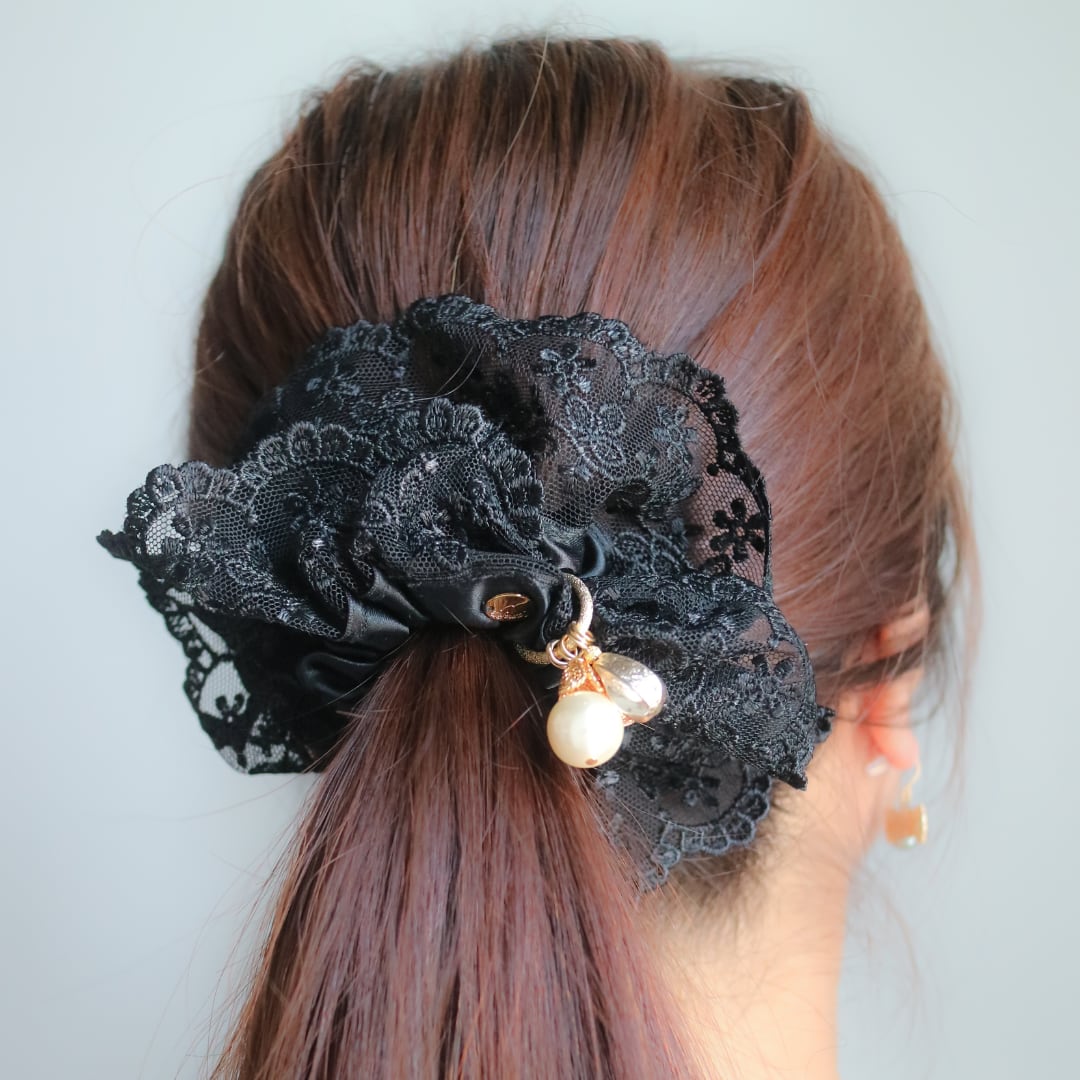 ヴィンテージパールとシルバービーズがきらめく、特別なブラックシュシュ。