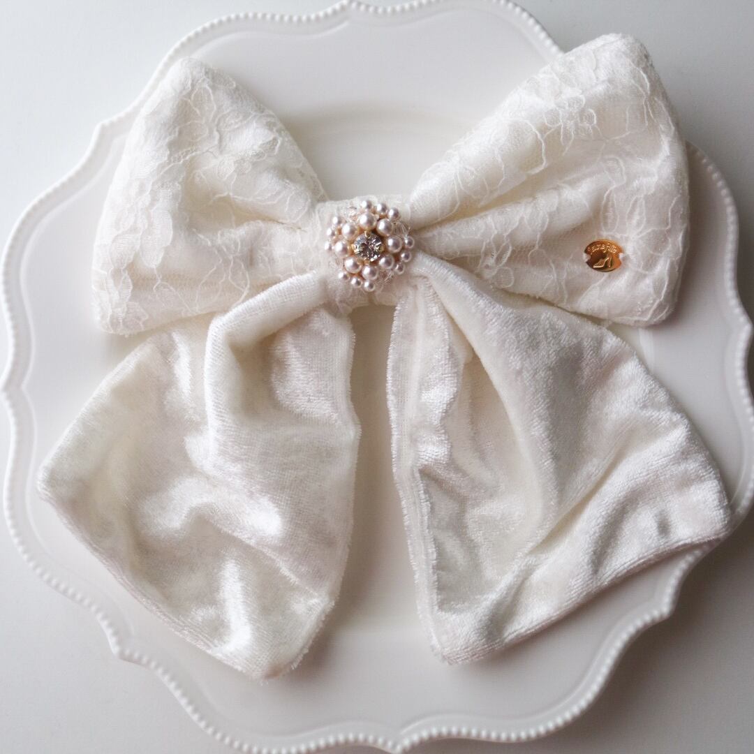 澄んだ輝きを添える、ピュアな大人ベロアレースリボンクリップ - Lumière Blanche(リュミエール・ブランシュ)