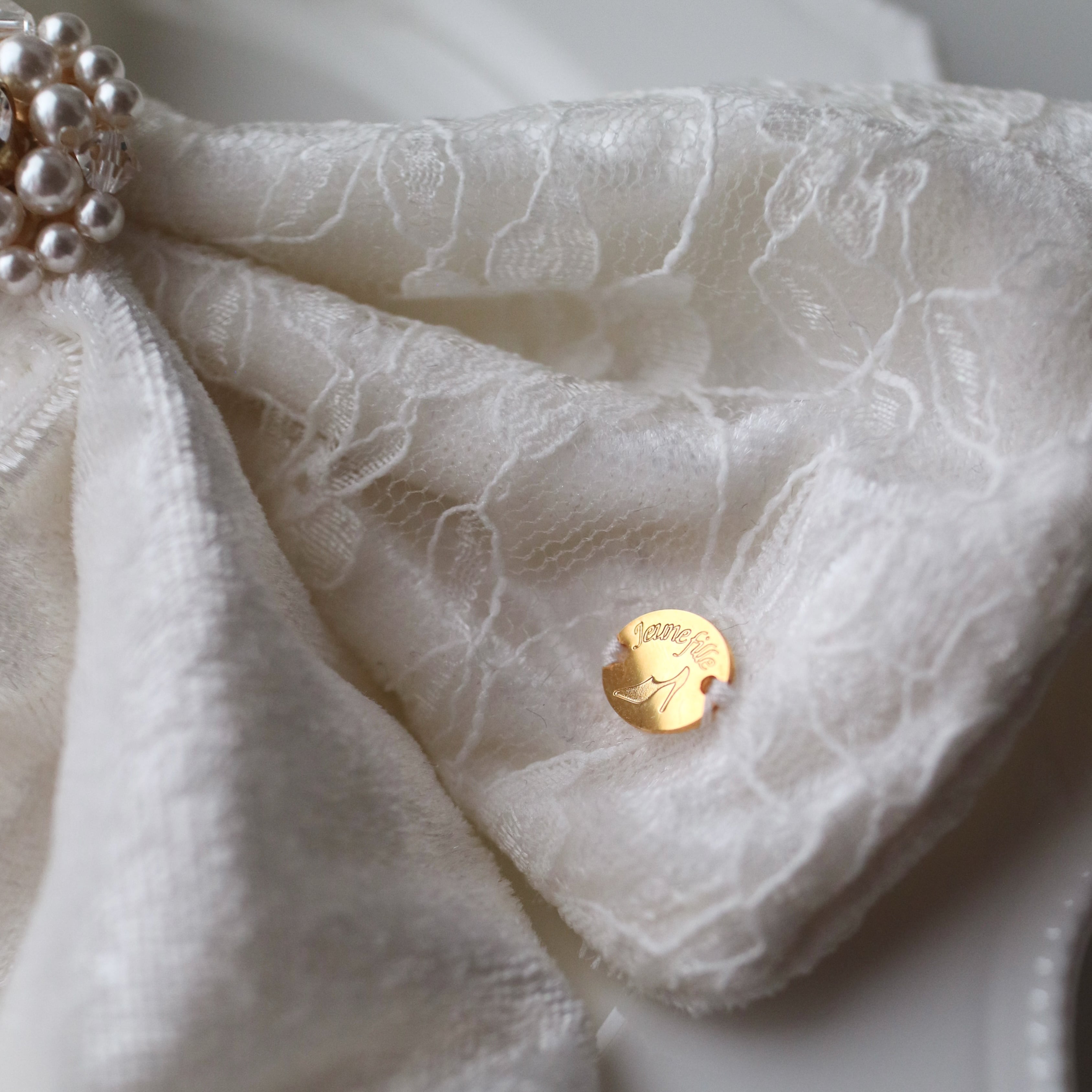 光沢のある優しい白ベロアに花柄のレース生地を重ねたオリジナルリボンクリップ。中心にはホワイトパールと凛とした透明感のクリスタルを組み合わせ、丁寧に編み込んだビーズモチーフをあしらいました。