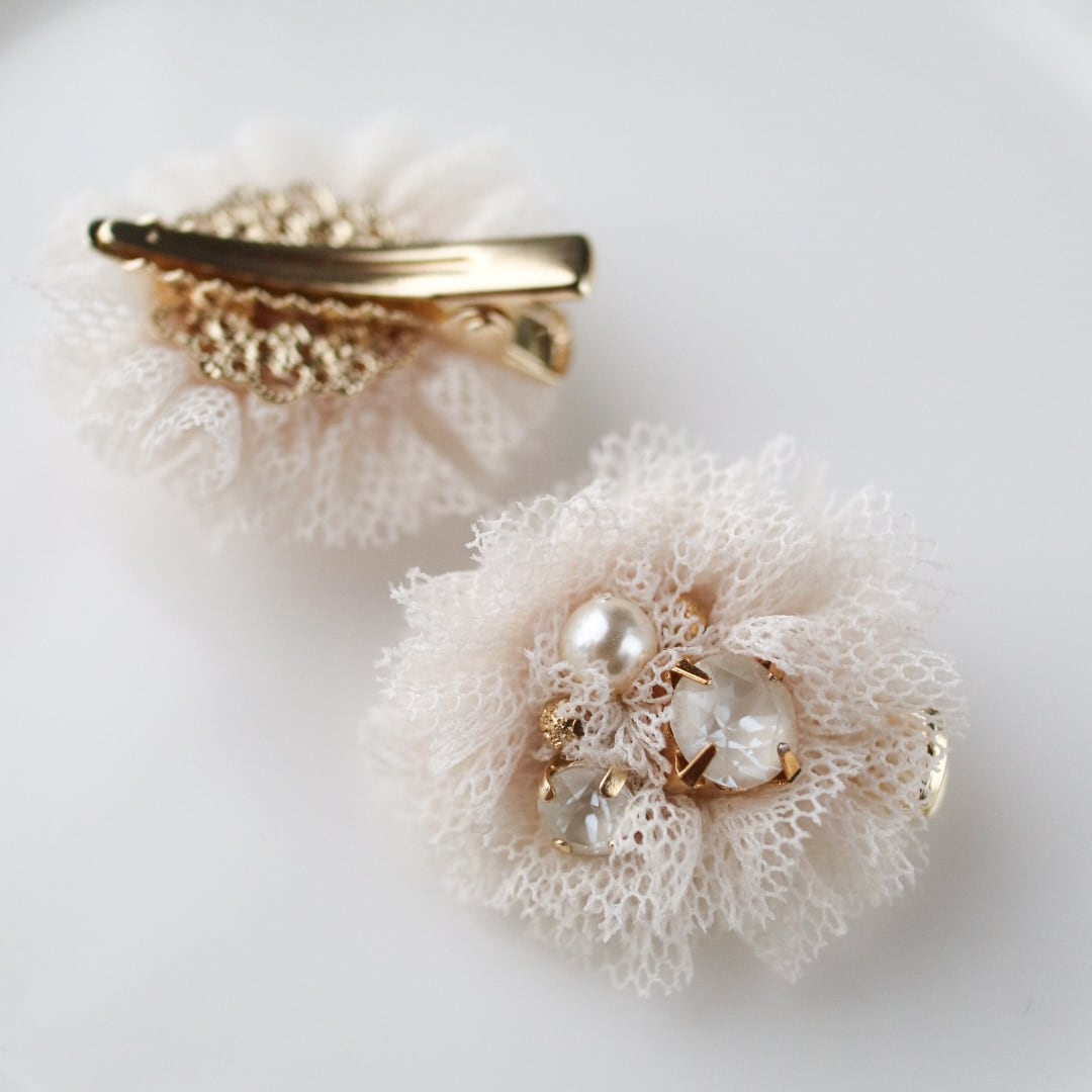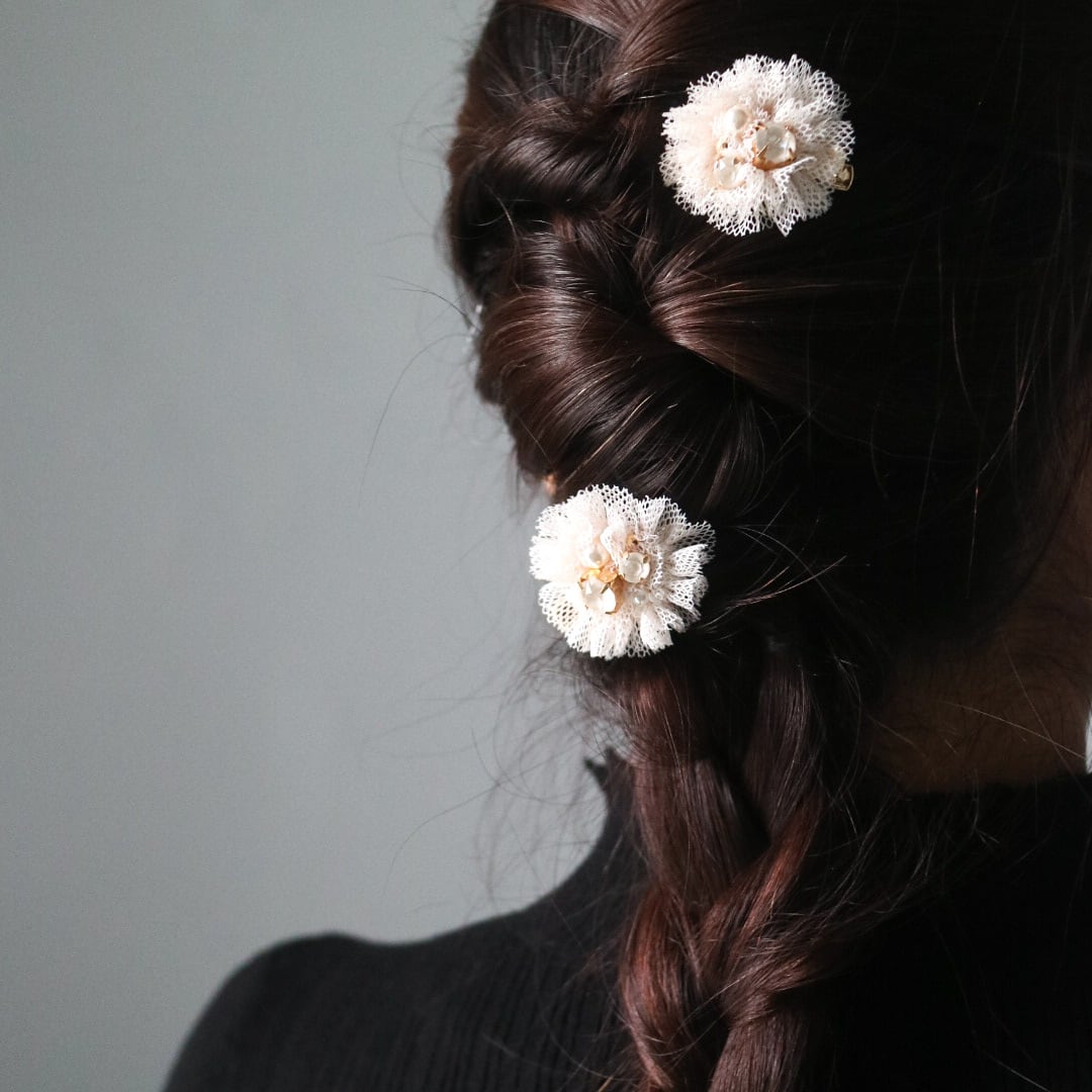 ふわりと空気を含んだ、繊細なチュールにパールやクリスタルのやさしい光をまとわせたヘアクリップ 2個set。