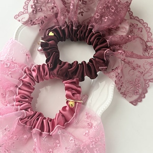 上品な艶をたたえた両面サテンを重ねたハーフレースシュシュ。