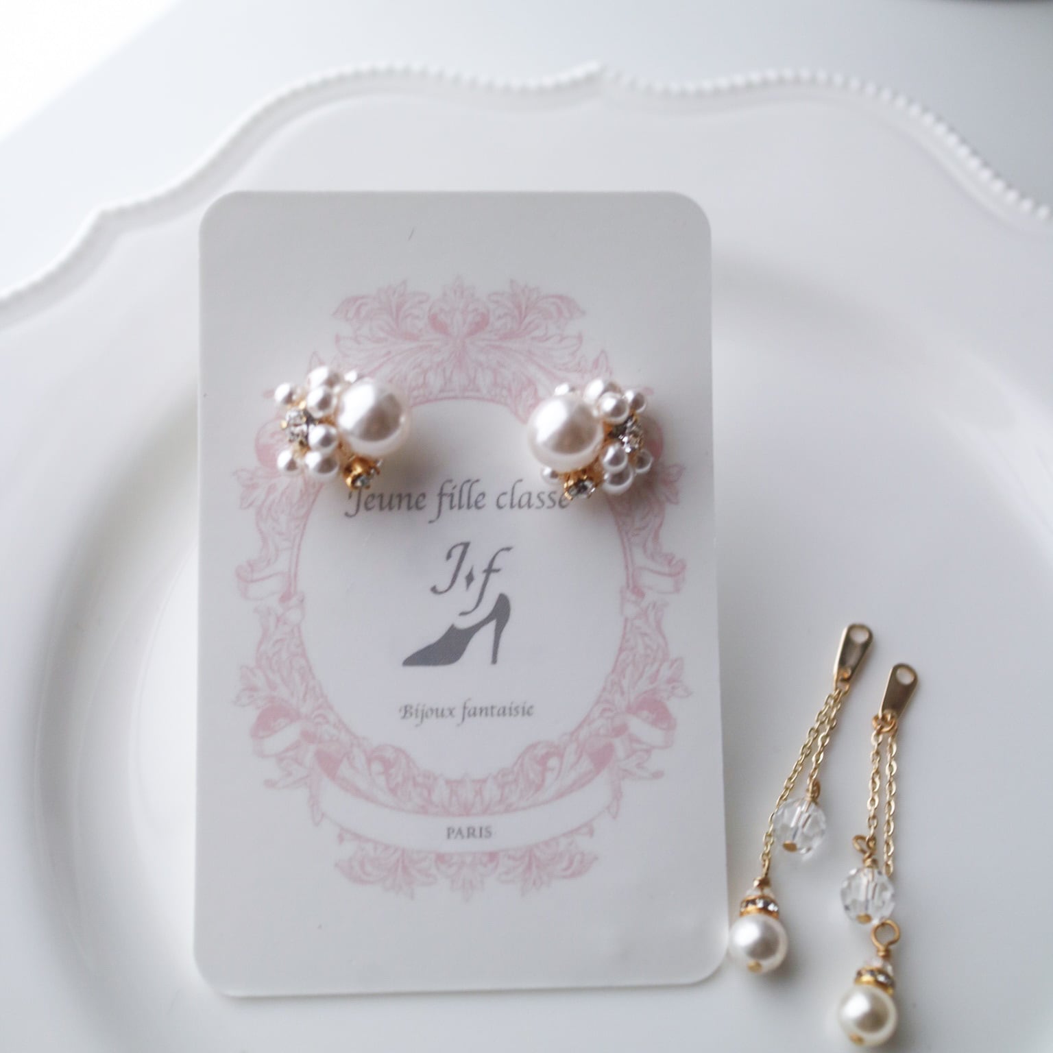 ピアスはチャーム取り外し可能の2way仕様、イヤリングはチャーム固定で手軽に華やかさを楽しめます。