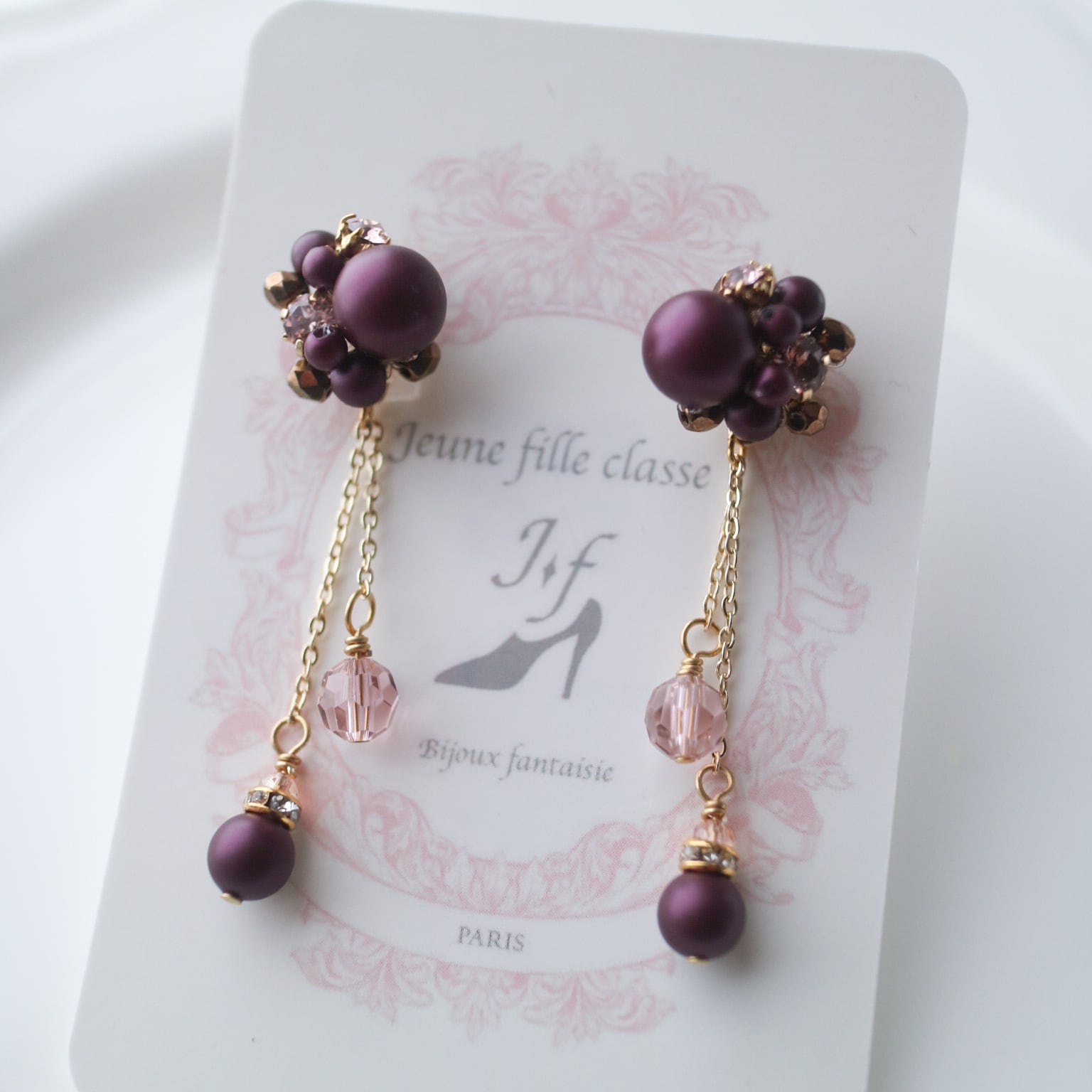 チェーンに組み合わせたロンデルやパール、ガラスビーズが耳元で揺れるたび、ベリーカラーの柔らかく甘酸っぱい光をまとい、耳元に表情豊かな華やぎを生み出します。