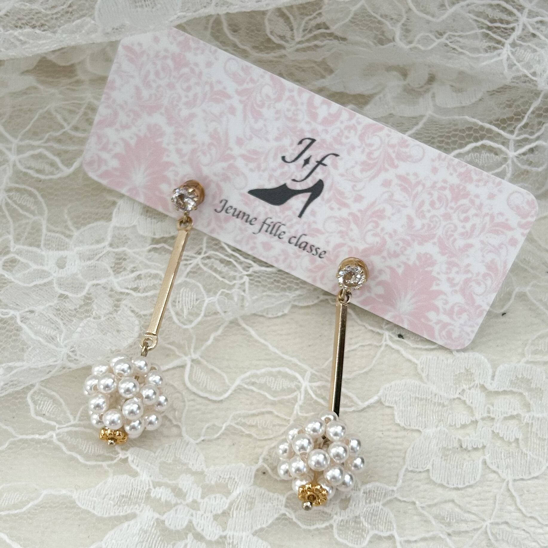 3mmのスワロフスキーパールを丁寧に編み込んで作り上げた丸いフォルムが、ポイントの洗練されたロングピアスです。