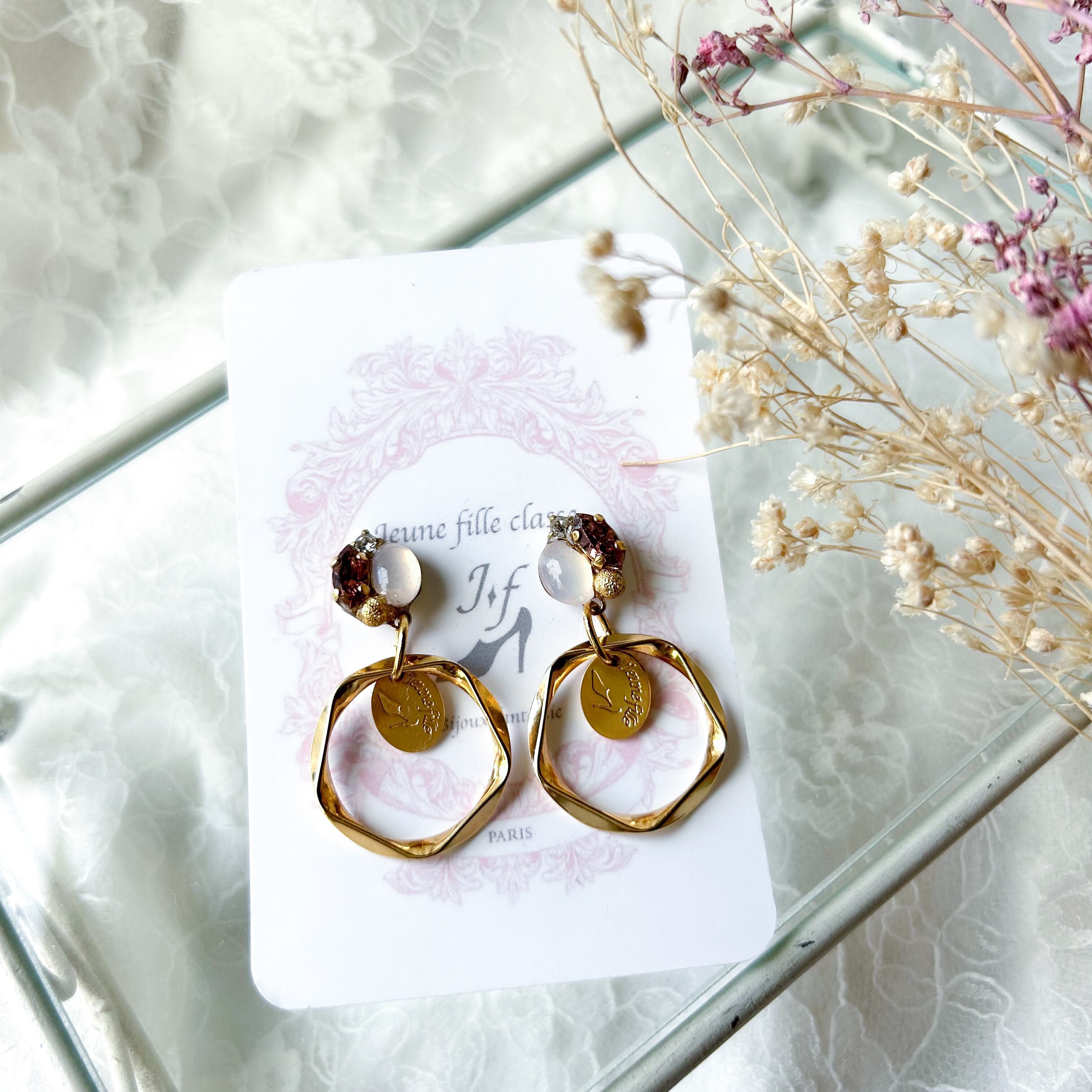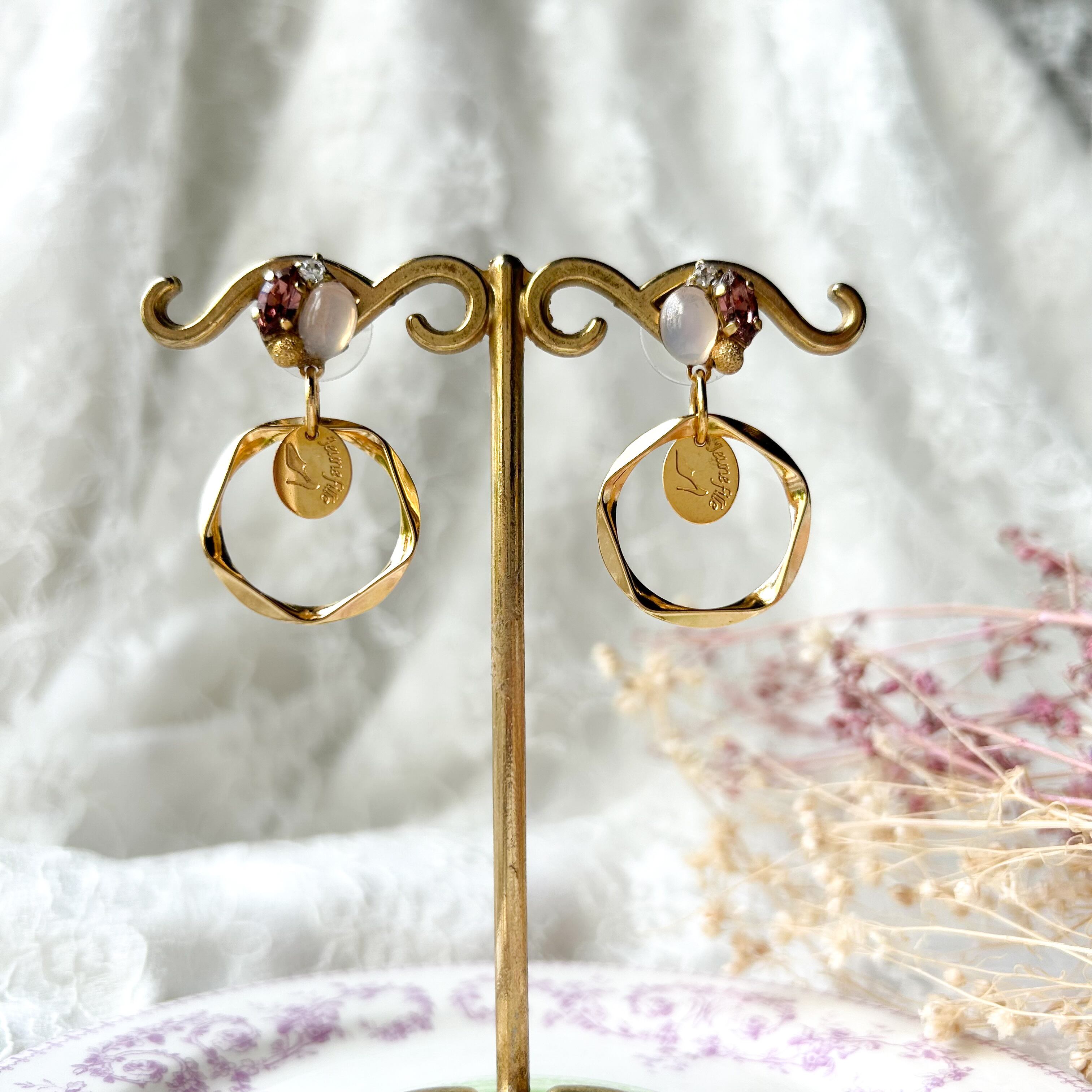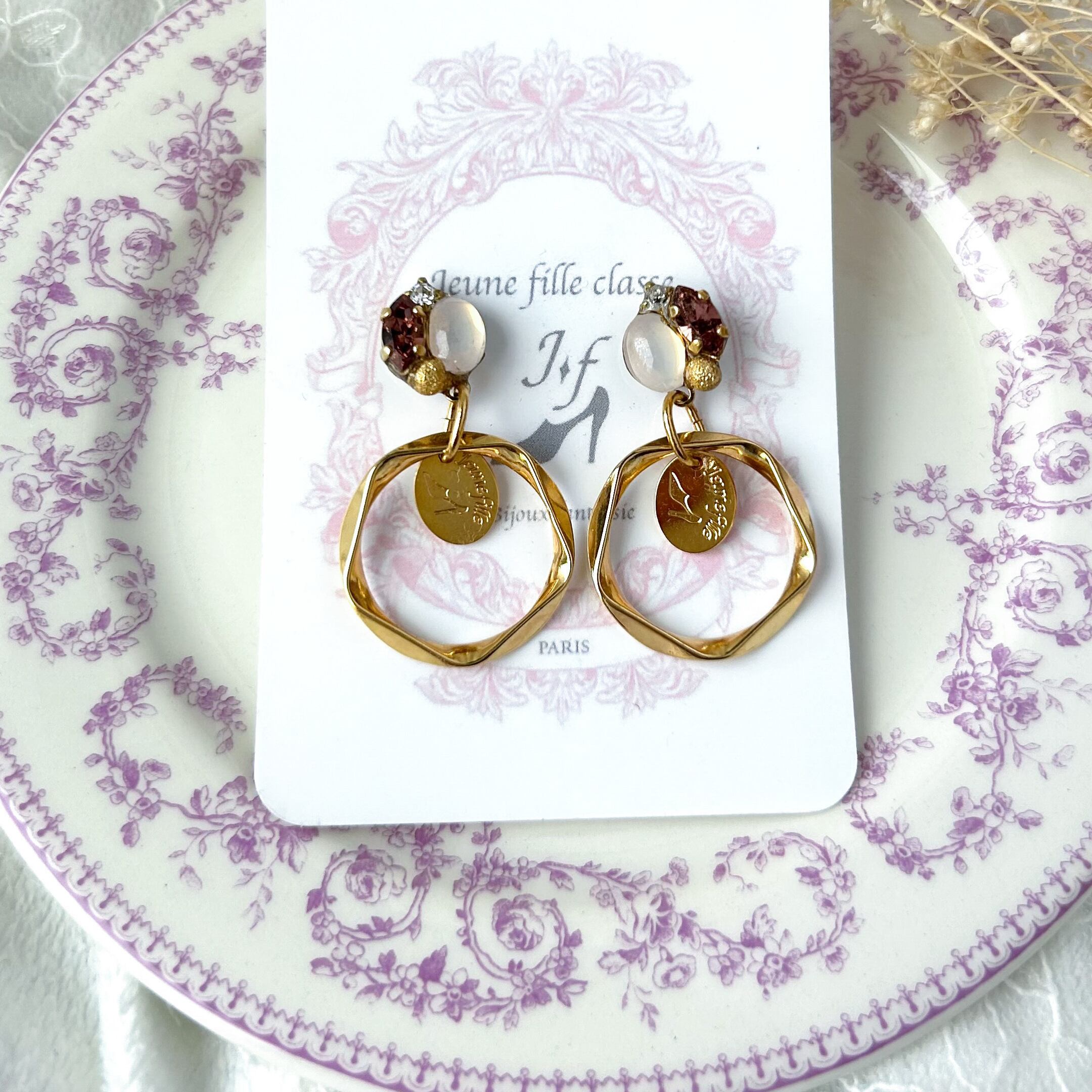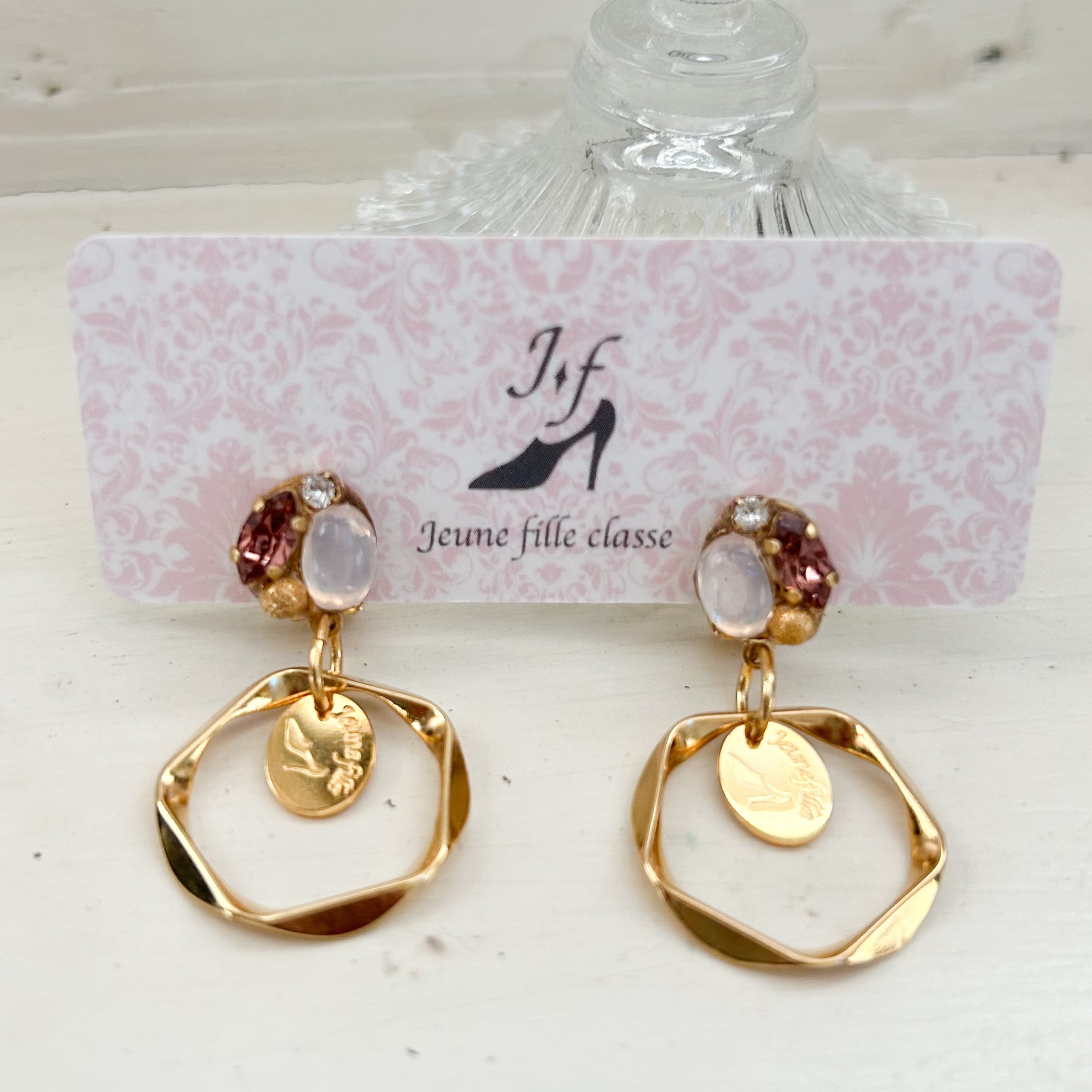 Parisヴィンテージクリスタル&フープピアス、イヤリングは洗練された女性にぴったりのピンクアクセサリー。煌めくパリのヴィンテージストーンとクリスタルが耳元で上品な光を放ち、繊細な中にも存在感を演出してくれます。さりげないフープパーツがアクセントになり、つけるだけで、華やかさを演出してくれます。やわらかな曲線を描くフープモチーフなので、角度によって見え方が変化する、表情豊かなアイテムです。